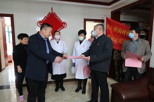 圖為后八里溝村黨委書記宋偉(右二)帶領黨員志愿服務隊入戶排查。