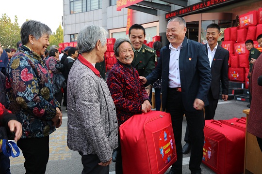 圖為宋偉(右二)為轄區(qū)老年人發(fā)放重陽節(jié)節(jié)日福利。