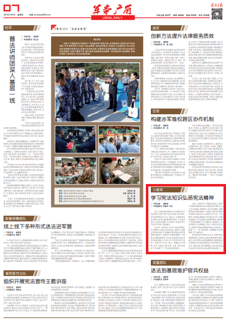 近年來,火箭軍成立10余個(gè)普法講師團(tuán),針對(duì)新修訂、新出臺(tái)的兵役法、退役軍人保障法等法律法規(guī),分專題編寫普法教案、制作微視頻,遴選骨干力量進(jìn)行專題授課輔導(dǎo),開展重點(diǎn)法規(guī)政策解讀。針對(duì)民法典頒布實(shí)施,部隊(duì)各級(jí)采取網(wǎng)上聽、線下學(xué)、有獎(jiǎng)答等形式,組織一次集中學(xué)習(xí)討論、推出一批精品學(xué)習(xí)課程、舉辦一場網(wǎng)上知識(shí)競答、開展一期專項(xiàng)送法下連,提高了廣大官兵依法維權(quán)能力。