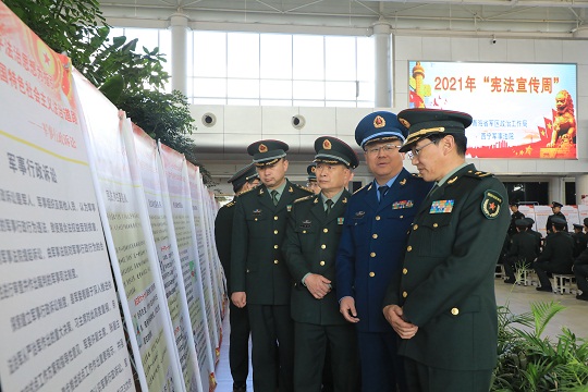 “在全面依法治軍、全面從嚴(yán)治軍新的征程上,只有將憲法至上的理念銘刻于心、外化于行,才能不斷激發(fā)官兵弘揚(yáng)憲法精神,貫徹依法治軍、從嚴(yán)治軍?!蔽鞑繎?zhàn)區(qū)第二軍事法院領(lǐng)導(dǎo)說(shuō),戰(zhàn)區(qū)法院在網(wǎng)上開(kāi)設(shè)憲法宣傳周欄目,推出形式多樣的普法產(chǎn)品,增派兩名網(wǎng)上值班法官及時(shí)提供法律咨詢,利用營(yíng)區(qū)大屏幕滾動(dòng)播放國(guó)家憲法日和憲法宣誓制度短片,發(fā)放編印的《防范非法集資詐騙》等法律書籍。
