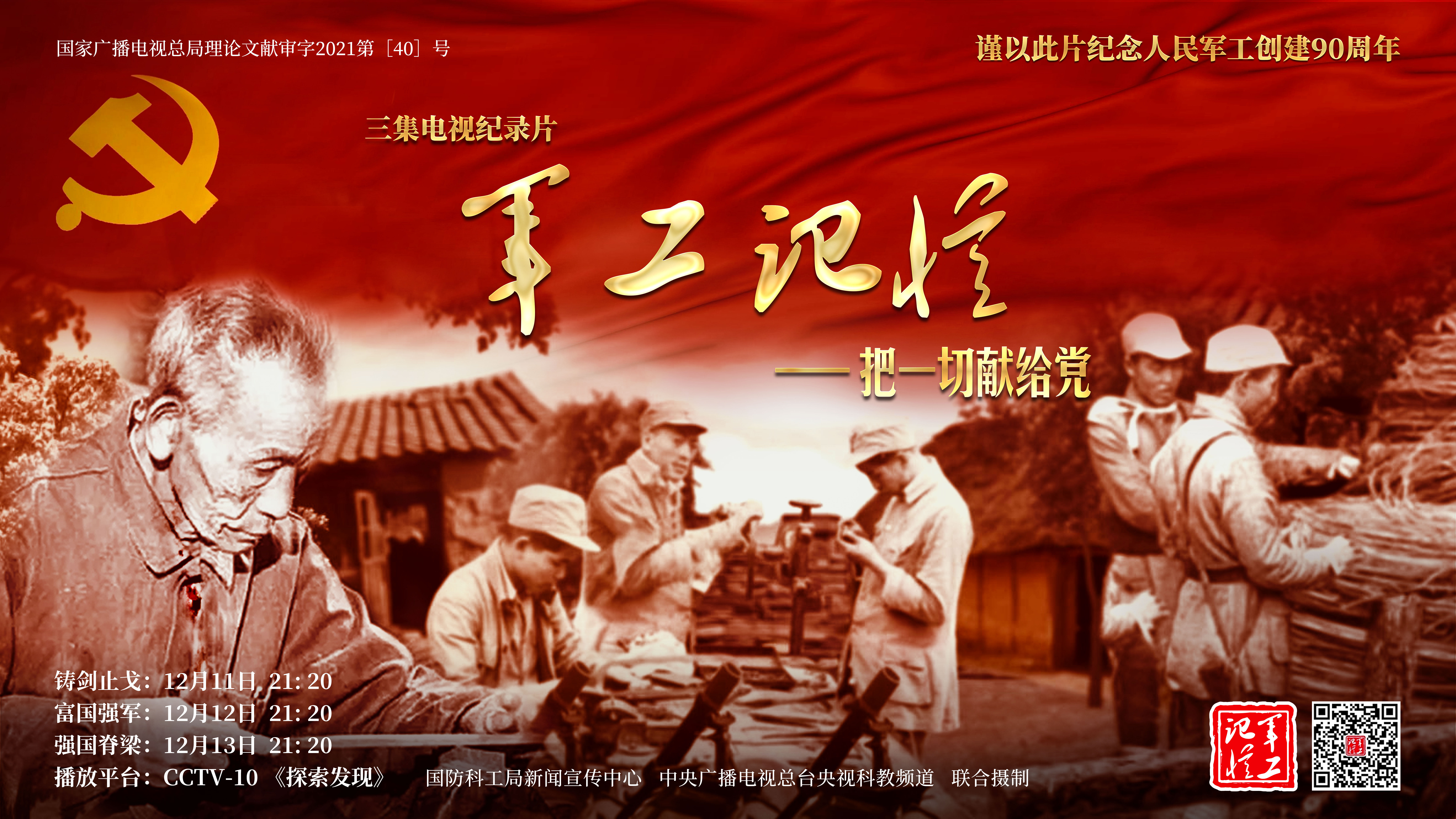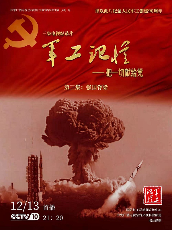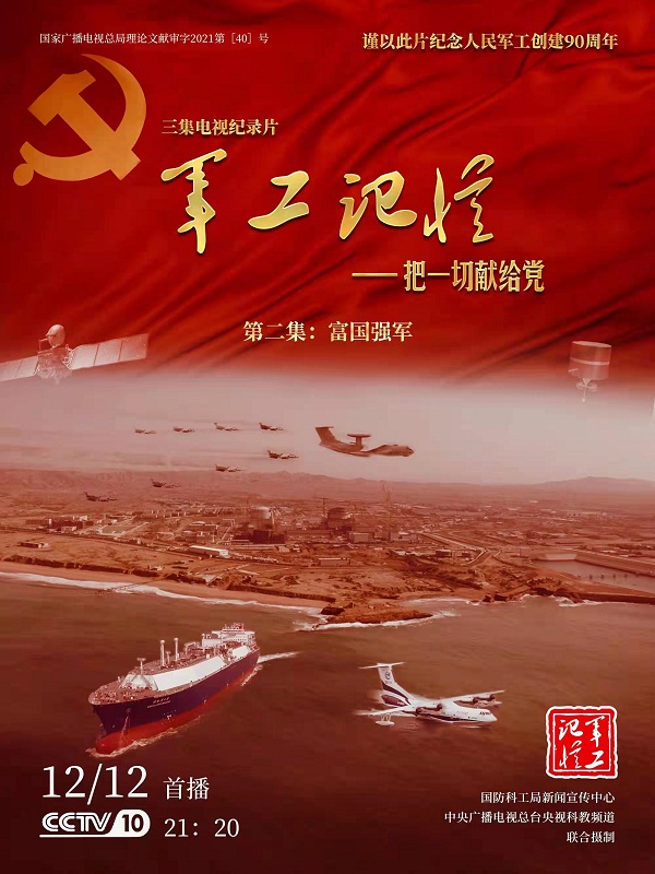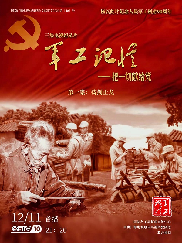 為慶祝中國共產(chǎn)黨成立100周年,紀(jì)念黨領(lǐng)導(dǎo)下的人民軍工創(chuàng)建90周年,由國防科工局指導(dǎo),國防科工局新聞宣傳中心聯(lián)合中央廣播電視總臺社教節(jié)目中心攝制,各軍工集團(tuán)大力支持的3集重大理論文獻(xiàn)電視紀(jì)錄片《軍工記憶——把一切獻(xiàn)給黨》,將于12月11日21:20在央視科教頻道(CCTV-10)《探索發(fā)現(xiàn)》欄目首播,連續(xù)播出3天。該紀(jì)錄片旨在向建黨百年獻(xiàn)禮,向人民軍工90周年致敬,向全社會弘揚(yáng)軍工精神傳遞軍工文化,激勵國防科技工業(yè)戰(zhàn)線廣大干部職工不忘初心、接續(xù)奮斗,為實現(xiàn)強(qiáng)軍強(qiáng)國夢想貢獻(xiàn)力量。