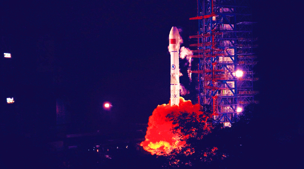 圖為本次任務(wù)中長(zhǎng)三乙火箭托舉天鏈二號(hào)02星劍指蒼穹。