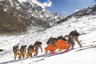 該連物資運(yùn)送小分隊(duì)徒步往崗拉哨所送年貨。張照杰 攝