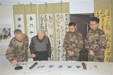 活動現(xiàn)場,女生獨(dú)唱《莫斯科郊外的晚上》、詩朗誦《奮進(jìn)一流譜新篇》……一個個軍地聯(lián)合自編自演的節(jié)目受到歡迎。洛陽市書畫院的書法愛好者現(xiàn)場揮毫潑墨,多種書體各顯神韻。老干部、老阿姨拿著一副副寓意深刻、飽含祝福的春聯(lián)、“?!弊郑残︻侀_。