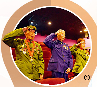圖①:五里墩街道組織老兵觀看電影《長津湖》,電影結(jié)束后,老兵起立敬禮。