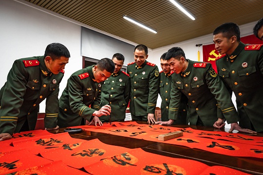 圖為官兵們?cè)趯懘郝?lián)。金玥林 攝