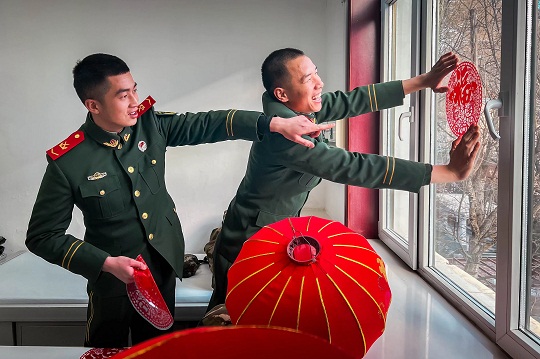 圖為官兵們?cè)谫N窗花。金玥林 攝