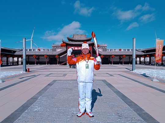 圖為通占元在冬奧火炬?zhèn)鬟f點(diǎn)河北省張北縣德勝村進(jìn)行火炬?zhèn)鬟f。溫曉敏 攝