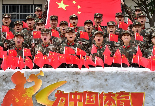 圖為官兵為奧運(yùn)健兒加油。