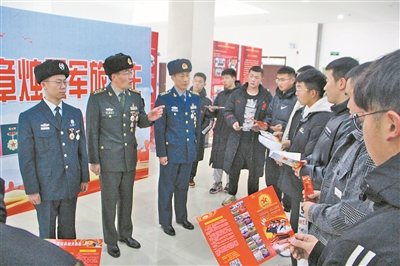他們請(qǐng)功臣英?!鞍血?jiǎng)?wù)伦C章戴起來”,參與征兵工作。軍分區(qū)依據(jù)相關(guān)規(guī)定,制訂了佩戴獎(jiǎng)?wù)伦C章細(xì)則,規(guī)范佩戴獎(jiǎng)?wù)伦C章的類型、方法和時(shí)機(jī)。從征兵宣傳、體檢政考、役前教育訓(xùn)練,一直到審批定兵、新兵啟運(yùn)等各個(gè)環(huán)節(jié),全軍分區(qū)67名榮立過軍功的現(xiàn)役和文職人員以及所屬干休所41名戰(zhàn)功卓著的離休老干部全程參與,與預(yù)征青年面對(duì)面,講述自己的從軍經(jīng)歷、成長(zhǎng)過程和軍旅感悟。與此同時(shí),他們要求各基層武裝部在為立功受獎(jiǎng)官兵送喜報(bào)時(shí),組織預(yù)征青年代表參加,舉辦“軍功章照耀軍旅人生”主題報(bào)告會(huì)、“功臣故事分享會(huì)”等活動(dòng)。3年來,這個(gè)軍分區(qū)先后舉辦80多場(chǎng)主題報(bào)告會(huì)、故事分享會(huì),以榮譽(yù)激發(fā)動(dòng)力,讓榜樣催人前行。