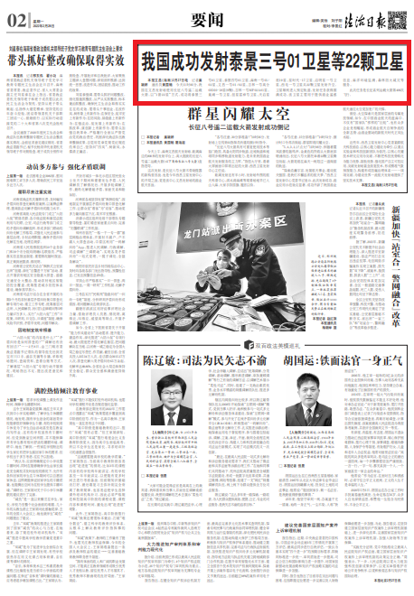 本報文昌(海南)2月27日電 記者廉穎婷 通訊員黃國暢 今天11時06分,我國在文昌發(fā)射場使用長征八號遙二運載火箭,以“1箭22星”方式,成功將泰景三號01衛(wèi)星、泰景四號01衛(wèi)星、海南一號01/02星、文昌一號01/02星、吉林一號高分03D10-18星(9顆)、吉林一號MF02A01星、巢湖一號衛(wèi)星、創(chuàng)星雷神號衛(wèi)星、天啟星座19星、星時代-17衛(wèi)星、啟明星一號衛(wèi)星、西電一號衛(wèi)星共22顆衛(wèi)星發(fā)射升空。衛(wèi)星順利進(jìn)入預(yù)定軌道,發(fā)射任務(wù)獲得圓滿成功。該衛(wèi)星主要用于提供商業(yè)遙感信息、海洋環(huán)境監(jiān)測、森林防火減災(zāi)等服務(wù)。