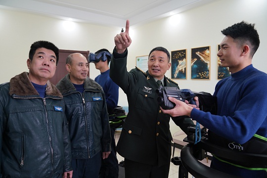 圖為汪曉紅(右二)與飛行員一起體驗(yàn)?zāi)M訓(xùn)練系統(tǒng)。張永進(jìn) 攝