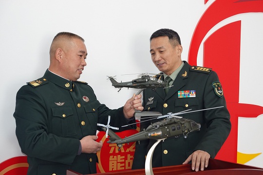 圖為汪曉紅(右)向一級軍士長喬壽和了解不同型號直升機(jī)性能差異。張永進(jìn) 攝