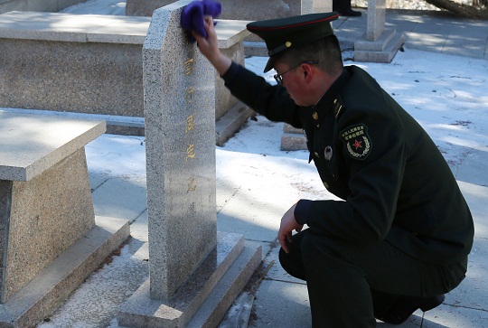 圖為烏魯木齊軍事檢察院檢察官認真擦拭墓碑塵土。彭建 攝