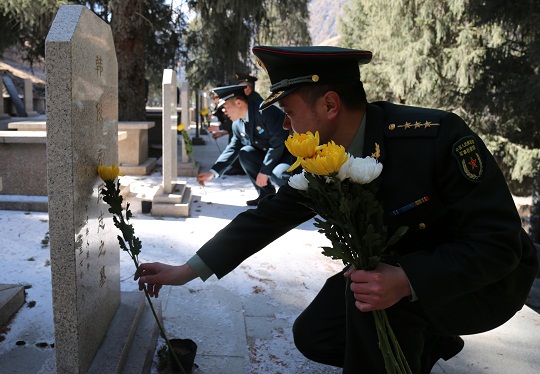 圖為烏魯木齊軍事檢察院檢察官為英烈墓碑敬獻鮮花。彭建 攝