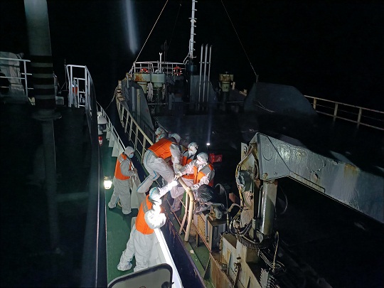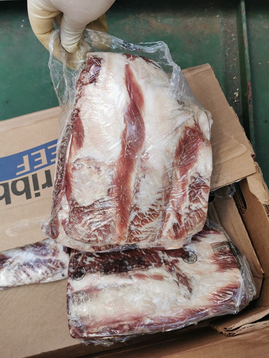 3月30日,涉案走私團(tuán)伙準(zhǔn)備在山東威海海域?qū)嵤┳咚椒缸锘顒?dòng)。得知線索后,山東海警局立即派遣威海海警局執(zhí)法艦艇前往目標(biāo)海域開展查緝。在執(zhí)法艦艇發(fā)現(xiàn)嫌疑船舶并靠近過程中,該走私船舶突然加速意欲逃離,海警執(zhí)法員果斷將其逼停,并組織船舶登檢。經(jīng)查,該船于3月23日自韓國裝載無合法來源和未經(jīng)檢驗(yàn)檢疫的日本進(jìn)口和牛肉后,關(guān)閉AIS設(shè)備進(jìn)入威海海域,被山東海警局當(dāng)場查獲。