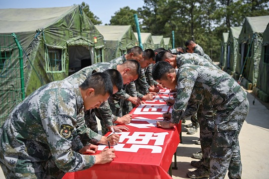 圖為官兵在“強化國家安全意識 推進強軍興軍偉業(yè)”條幅上簽名。