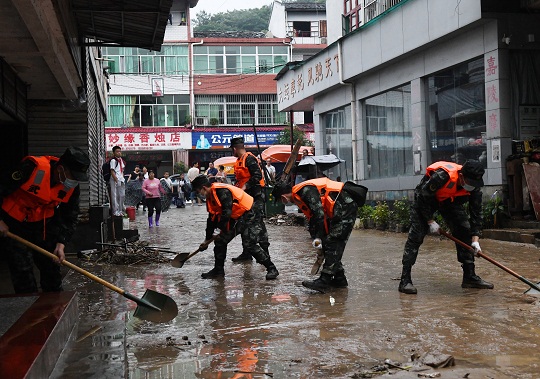 圖為武警官兵齊心協(xié)力清掃街道淤泥。
