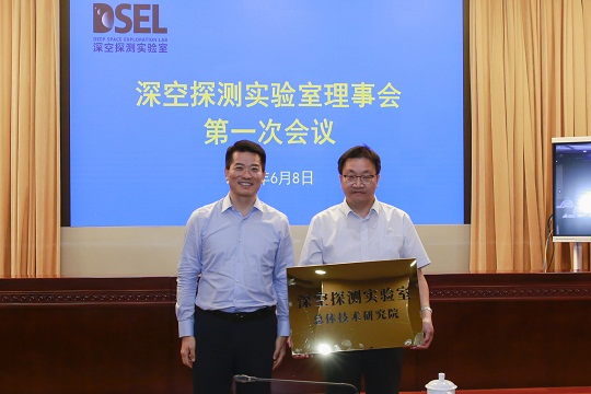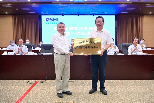 圖為國家航天局局長張克儉(左)為深空探測(cè)創(chuàng)新中心授牌。張高翔 攝
