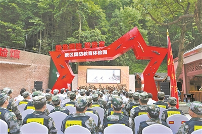 筆者走下景區(qū)“強(qiáng)軍號(hào)”小火車,一座紅色五角星形狀的“國(guó)防門”便映入眼簾,門上“愛我國(guó)防愛我家”7個(gè)大字引人注目。門內(nèi)的國(guó)防教育體驗(yàn)園,是景區(qū)里一處別樣的風(fēng)景,也是近期熱度飆升的新晉熱門“打卡地”。據(jù)統(tǒng)計(jì),85%的游客主動(dòng)進(jìn)園體驗(yàn)。