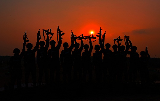 圖為夕陽西下,官兵結束了一天的訓練。