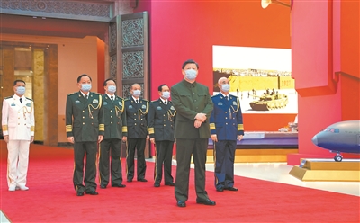 下午4時30分許,習近平來到中國人民革命軍事博物館,步入展廳參觀展覽。展覽聚焦以習近平同志為核心的黨中央領導國防和軍隊建設的偉大實踐,安排8個單元展區(qū),設置“黨在新時代的強軍目標”、“重整行裝再出發(fā)”、“礪劍鑄盾 奔向一流”、“大好河山 寸土不讓”、“愛我人民愛我軍”、“深情勵三軍 奮進新征程”等重點展項,通過1400余件文物實物、630余張照片、近百套武器裝備模型以及大量圖表、視頻、藝術作品、互動項目等,生動展示了新時代國防和軍隊建設的壯闊歷程和偉大成就,充分展現了人民軍隊忠誠維護核心、矢志奮斗強軍的昂揚風貌。習近平不時駐足觀看,認真聽取講解,詢問有關情況。