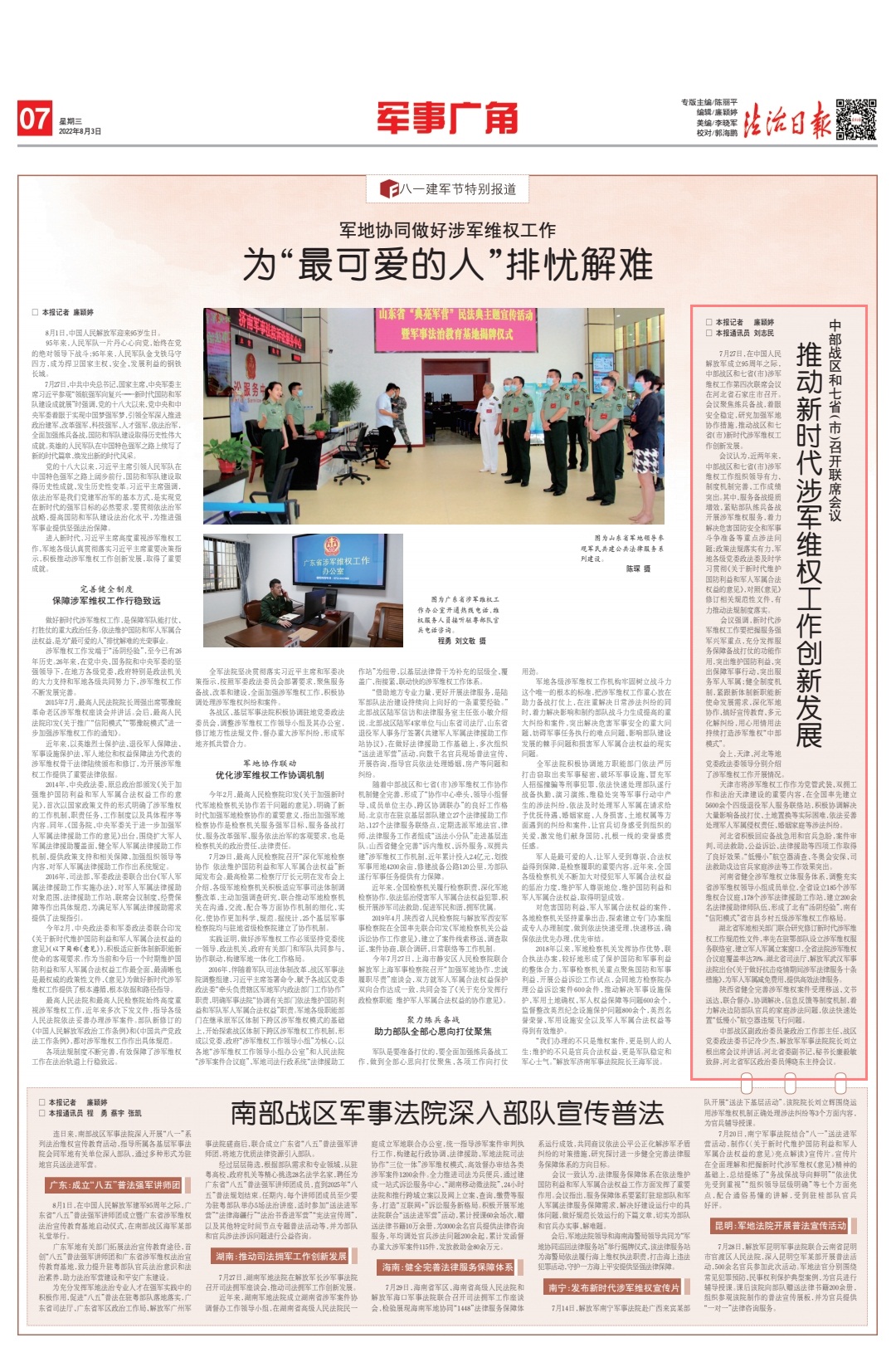 湖北省軍地相關(guān)部門聯(lián)合研究修訂新時代涉軍維權(quán)工作規(guī)范性文件,率先在駐鄂部隊設(shè)立涉軍維權(quán)服務(wù)聯(lián)絡(luò)室,建立軍人軍屬立案窗口,全省法院涉軍維權(quán)合議庭覆蓋率達70%。湖北省司法廳、解放軍武漢軍事法院出臺《關(guān)于做好抗擊疫情期間涉軍法律服務(wù)十條措施》,為軍人軍屬減免費用、提供高效法律服務(wù)。