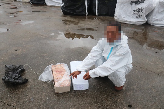 經(jīng)過2個(gè)多小時(shí)的搜索,海警巡邏艦成功在目標(biāo)海域發(fā)現(xiàn)嫌疑船只,海警執(zhí)法員隨即依法進(jìn)行登船檢查。經(jīng)查,該嫌疑船船倉內(nèi)裝有大量黑色及白色塑料袋,袋內(nèi)裝有疑似來自境外的凍豬耳、凍豬肚等凍品約190噸,現(xiàn)場抓獲3名嫌疑人,且隨船未能找到該批凍品的任何合法來源證明。