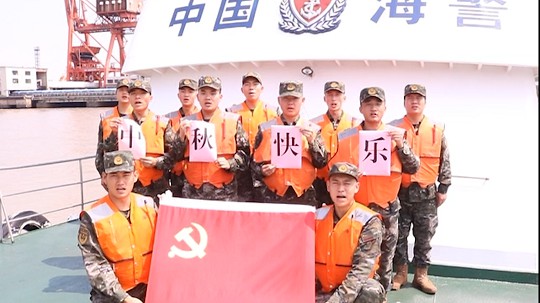 “我們是上海崇明海警局巡邏艇,海疆有我們守衛(wèi),請祖國和人民放心。值此中秋佳節(jié)之際,祝全國人民中秋節(jié)快樂,愿明月把我們的思念與祝福帶到你身邊?!?/p>