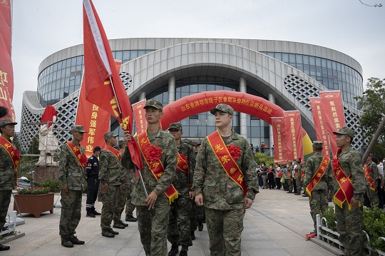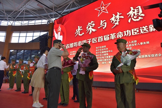 圖為山東省濰坊市坊子區(qū)首屆革命功臣送新兵活動(dòng)現(xiàn)場(chǎng)。