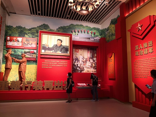 在“重整行裝再出發(fā)”專題展項(xiàng),“古田會(huì)議永放光芒”八個(gè)大字,將人們的思緒帶到福建省上杭縣古田村。1929年,紅四軍黨的第九次代表大會(huì)在此召開,確立了“思想建黨、政治建軍”的原則,確立了黨對(duì)軍隊(duì)的絕對(duì)領(lǐng)導(dǎo)。2014年,全軍政治工作會(huì)議在這里召開,對(duì)新時(shí)代政治建軍作出部署,恢復(fù)和發(fā)揚(yáng)我黨我軍光榮傳統(tǒng)和優(yōu)良作風(fēng),以整風(fēng)精神推進(jìn)政治整訓(xùn),全面加強(qiáng)軍隊(duì)黨的領(lǐng)導(dǎo)和黨的建設(shè),深入推進(jìn)軍隊(duì)黨風(fēng)廉政建設(shè)和反腐敗斗爭(zhēng),推動(dòng)人民軍隊(duì)政治生態(tài)根本好轉(zhuǎn)。自此開啟思想建黨、政治建軍新征程。