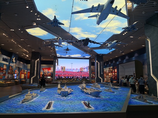 在“深入推進(jìn)科技強(qiáng)軍”單元展區(qū),我軍現(xiàn)役主戰(zhàn)裝備模型臺(tái)最為吸睛,上面陳列著殲-20、運(yùn)-20、遼寧艦、山東艦等60型87件現(xiàn)役主戰(zhàn)裝備模型。