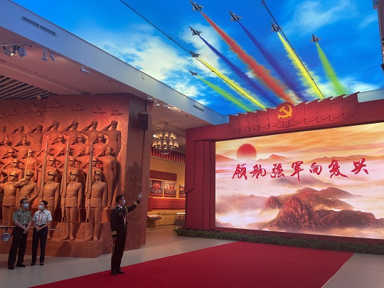 圖為“領(lǐng)航強(qiáng)軍向復(fù)興——新時(shí)代國(guó)防和軍隊(duì)建設(shè)成就展”展廳。