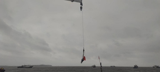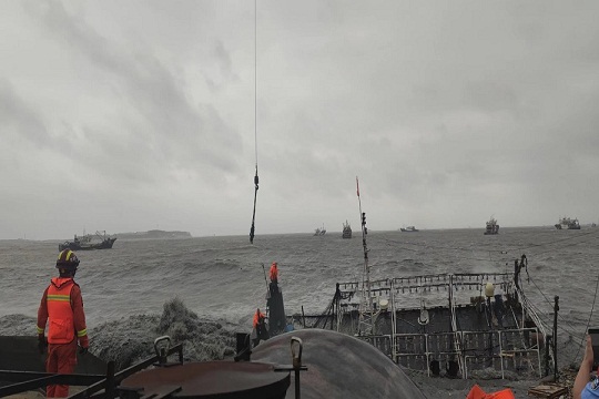 9月16日,山東威海海警局接到報(bào)警稱,一艘漁船在榮成市神飛造船廠附近海域發(fā)生船舶傾覆,兩名群眾被困,受臺(tái)風(fēng)“梅花”影響,事發(fā)海域風(fēng)力達(dá)7級(jí)以上,浪高3-5米,情況十分危急。海警執(zhí)法員第一時(shí)間趕赴現(xiàn)場,并對接相關(guān)部門聯(lián)合行動(dòng)。海警執(zhí)法員不斷向被困群眾喊話安撫情緒,并采取吊車起吊的方式實(shí)施救援。經(jīng)過近一個(gè)小時(shí)的努力,兩名群眾安全脫困,目前身體狀況良好。