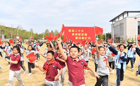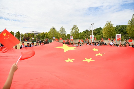 本報(bào)訊 通訊員徐偉 9月24日,在武警安徽總隊(duì)合肥支隊(duì)執(zhí)勤一大隊(duì)營(yíng)區(qū),武警官兵與小學(xué)生手持國(guó)旗一起歡呼奔跑。