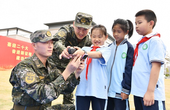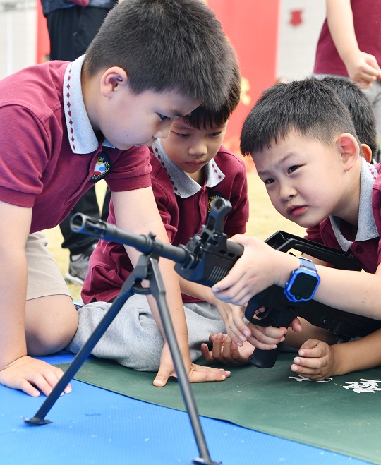 圖為小學(xué)生在體驗(yàn)操作武器裝備。