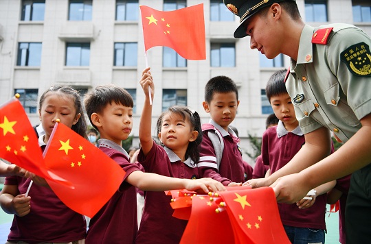 圖為武警戰(zhàn)士在向小學(xué)生發(fā)送手持國(guó)旗。