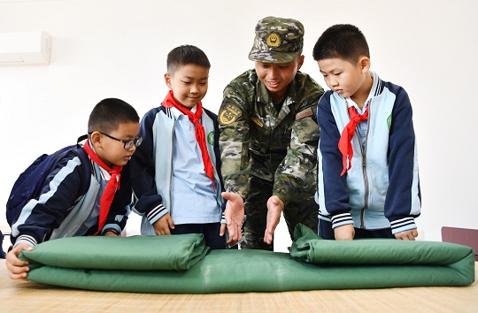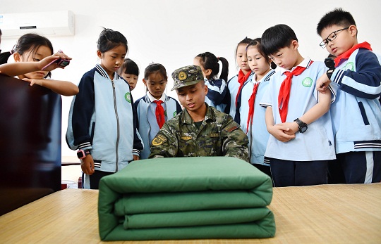 圖為武警戰(zhàn)士在向小學(xué)生演示疊軍被。