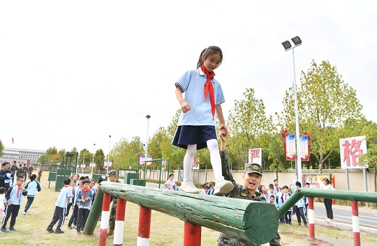 圖為小學(xué)生在武警官兵的指導(dǎo)下體驗(yàn)快速通過(guò)獨(dú)木橋。