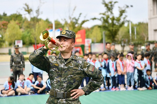 圖為武警戰(zhàn)士在向小學(xué)生演示吹奏軍號(hào)。