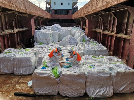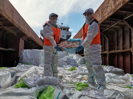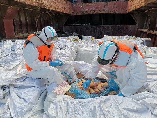 圖為海警執(zhí)法員對(duì)凍品進(jìn)行檢查。