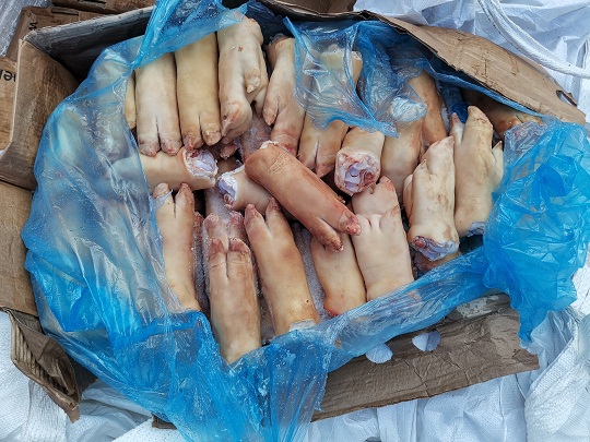 當(dāng)日上午8時(shí)許,廣東海警局接群眾舉報(bào),在廣東江門臺(tái)山市烏豬島對(duì)開海域有人進(jìn)行涉嫌走私活動(dòng)。該局立即指派廣東江門海警局執(zhí)法艇前往目標(biāo)海域進(jìn)行查緝。9時(shí)30分許,執(zhí)法員在目標(biāo)海域成功攔截該艘目標(biāo)船舶,經(jīng)登臨檢查發(fā)現(xiàn),船上共有5人,船艙內(nèi)裝有大量白色塑料袋,袋內(nèi)紙箱裝有豬肚、豬蹄、牛肚等凍品約130噸,船上人員均無法提供該批凍品的合法來源及檢驗(yàn)檢疫證明,涉嫌走私。