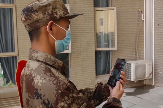 圖為預(yù)定新兵小朱撥打視頻電話與法院唐庭長進(jìn)行交流。