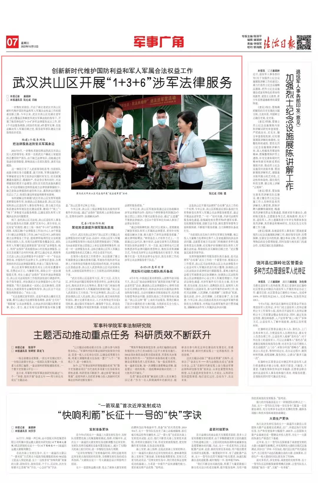 “武漢市洪山區(qū)是駐軍大區(qū)、軍工大區(qū)、兵員大區(qū),涉軍涉法問題呈現(xiàn)侵權(quán)類型多樣化、法律關(guān)系復(fù)雜化、維權(quán)訴求多元化等特點,靠某個部門單獨辦理已無法有效解決軍人軍屬遇到的困難問題?!焙樯絽^(qū)人武部部長王興松說,“針對這種情況,洪山區(qū)人武部協(xié)調(diào)洪山區(qū)人民法院、洪山司法局、地方高校和駐軍部隊,建立完善軍地共議、人才共育和宣傳共促3項機(jī)制,通過強(qiáng)化軍地協(xié)作、建強(qiáng)骨干隊伍、營造良好氛圍,匯聚整合軍地優(yōu)勢資源,有效提升洪山區(qū)司法擁軍服務(wù)質(zhì)效。”
