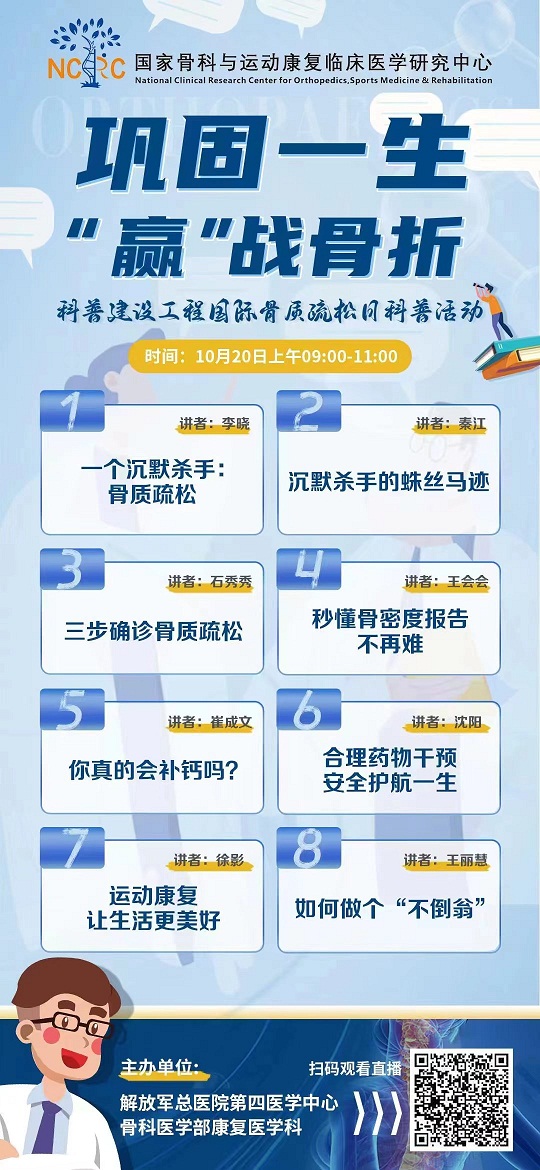 本報(bào)訊 見習(xí)記者韓瀟 通訊員李曉 石秀秀 10月20日,是世界衛(wèi)生組織確立的“國際骨質(zhì)疏松日”,今年中國的主題是“鞏固一生,贏戰(zhàn)骨折”。解放軍總醫(yī)院第四醫(yī)學(xué)中心骨科醫(yī)學(xué)部康復(fù)醫(yī)學(xué)科充分利用國家骨科與運(yùn)動(dòng)康復(fù)臨床醫(yī)學(xué)研究中心平臺(tái),即骨科與運(yùn)動(dòng)康復(fù)領(lǐng)域唯一的國家級(jí)臨床醫(yī)學(xué)研究中心,在“科普建設(shè)工程”版塊開展線上科普宣傳活動(dòng)?;顒?dòng)中,共有1萬余名患者及家屬登陸直播間觀看。這是該醫(yī)學(xué)部貫徹落實(shí)“健康中國2030發(fā)展綱要”的實(shí)際行動(dòng),目的是關(guān)注全國軍民各個(gè)年齡段骨骼健康,引導(dǎo)遠(yuǎn)離骨質(zhì)疏松危害,降低發(fā)生脆性骨折的風(fēng)險(xiǎn),提高健康生活質(zhì)量。
