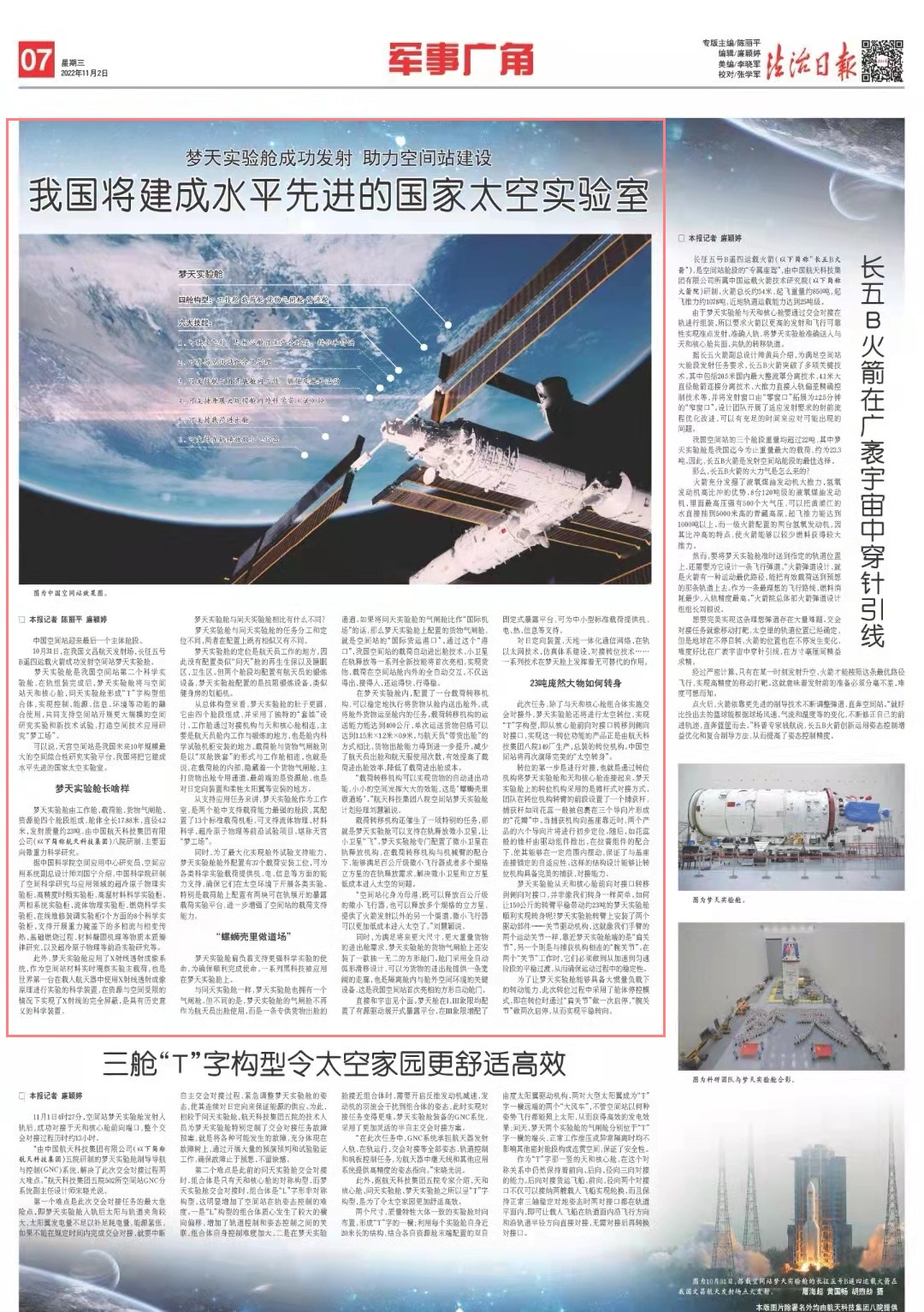 夢(mèng)天實(shí)驗(yàn)艙是我國(guó)空間站第二個(gè)科學(xué)實(shí)驗(yàn)艙,在軌組裝完成后,夢(mèng)天實(shí)驗(yàn)艙將與空間站天和核心艙、問(wèn)天實(shí)驗(yàn)艙形成“T”字構(gòu)型組合體,實(shí)現(xiàn)控制、能源、信息、環(huán)境等功能的融合使用,共同支持空間站開展更大規(guī)模的空間研究實(shí)驗(yàn)和新技術(shù)試驗(yàn),打造空間技術(shù)應(yīng)用研究“夢(mèng)工場(chǎng)”。