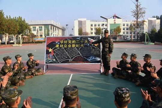“黨的二十大報告強調(diào),全面加強練兵備戰(zhàn),提高人民軍隊打贏能力。作為一名基層官兵,我深感責(zé)任在肩,時不我待!”近日,在中隊訓(xùn)練場上,一場學(xué)習(xí)分享會正在進行,官兵們利用訓(xùn)練間隙認真學(xué)習(xí)黨的二十大報告。
