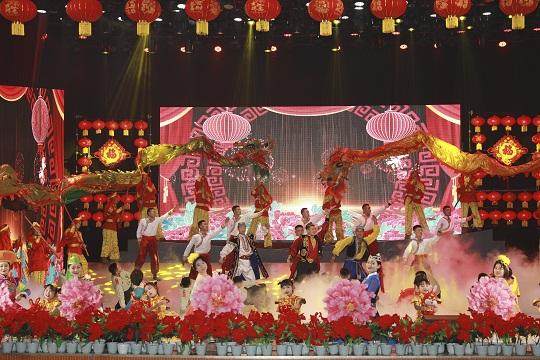 晚會在開場歌舞《錦繡盛世迎新春》中拉開帷幕,禮堂內(nèi)燈火璀璨、流光溢彩,舞臺上龍騰虎躍歡歌起舞,兵娃手提小燈籠歡呼雀躍,舞臺下人偶萌兔與現(xiàn)場觀眾揮手致意,呈現(xiàn)出一派其樂融融過大年的熱鬧景象。