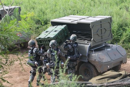 咸玉龍和戰(zhàn)友們借助機械外骨骼,從彈藥車上輕松取下無人車,然后兩人一組,迅速將近600公斤彈藥裝進無人車并貼上防護膜。隨后,咸玉龍并沒有像往常那樣“身先士卒”,而是置身幕后操控搭載著彈藥單元的無人車,直接穿過染毒地帶、往來穿梭于硝煙密布的演練場上,彈藥投送全程不見一兵一卒,高效精準。