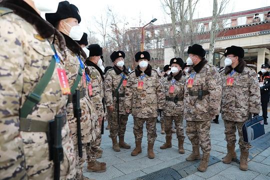 圖為武警青海總隊政委楊志強(右四)赴一線檢查勤務(wù)、慰問官兵。